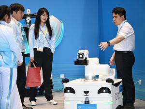 (250828) — TIANJIN, 28 agosto, 2025 (Xinhua) — Un empleado (d) presenta a un robot en el centro de medios para la próxima Cumbre de la Organización de Cooperación de Shanghai (OCS) 2025, en Tianjin, en el norte de China, el 28 de agosto de 2025. El centro de medios se inauguró aquí el jueves. (Xinhua/Li Ran) (da) (ra) (ce)