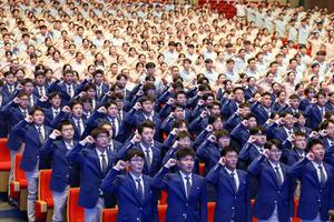(250621) -- TIANJIN, 21 junio, 2025 (Xinhua) -- Voluntarios para el foro Davos de Verano 2025 prestan juramento en una ceremonia, en Tianjin, en el norte de China, el 21 de junio de 2025. El foro Davos de Verano 2025 se celebrará del 24 al 26 de junio en Tianjin. Un total de 972 voluntarios de 12 universidades de la ciudad desempeñarán funciones en más de 50 categorías, incluyendo la recepción, la promoción de medios, el apoyo al transporte y la asistencia a la conferencia. (Xinhua/Sun Fanyue) (jg) (da)
