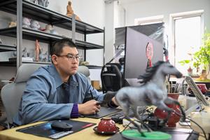 (260206) — TIANJIN, 6 febrero, 2026 (Xinhua) — Imagen del 5 de febrero de 2026 de un artista creando con una pluma electrónica en una computadora en la Oficina de Trabajo de Escultura Pintada de la Figura de Arcilla Zhang de Tianjin, en Tianjin, en el norte de China. La Oficina de Trabajo de Escultura Pintada de la Figura de Arcilla Zhang de Tianjin ha diseñado y creado recientemente una serie de esculturas pintadas con el tema del Año del Caballo para recibir el Año Nuevo chino. Estas obras de arte serán parte de una exposición temática del Año del Caballo en el Museo de Tianjin, que será abierta al público gratuitamente durante la Fiesta de la Primavera. (Xinhua/Sun Fanyue) (rtg) (ra) (vf)