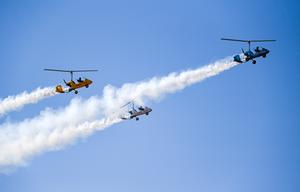 (251018) -- TIANJIN, 18 octubre, 2025 (Xinhua) -- Girocópteros realizan una presentación durante la séptima Exposición de Helicópteros de China, en la municipalidad de Tianjin, en el norte de China, el 18 de octubre de 2025. La exposición abrió sus puertas al público general el sábado. (Xinhua/Zhao Zishuo) (oa) (da)