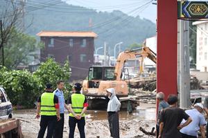 (250728) -- TIANJIN, 28 julio, 2025 (Xinhua) -- Trabajadores de emergencias laboran en la aldea de Xiaying del poblado de Xiaying, en el distrito de Jizhou, en Tianjin, en el norte de China, el 28 de julio de 2025. Casas, puentes y líneas eléctricas en algunas aldeas del distrito de Jizhou fueron dañados por las inundaciones provocadas por las fuertes lluvias recientes y la escorrentía río arriba. Las operaciones de emergencia locales, que incluyen búsqueda y rescate, traslado de evacuados y socorro, se llevan a cabo de forma ordenada. (Xinhua/Li Ran) (rtg) (ah) (vf)
