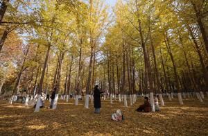 (251104) -- TIANJIN, 4 noviembre, 2025 (Xinhua) -- Personas disfrutan de la vista de un bosque de ginkgos en un parque forestal, en Tianjin, en el norte de China, el 4 de noviembre de 2025. (Xinhua/Sun Fanyue) (oa) (ah) (ce)