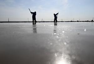 (250428) — TIANJIN, 28 abril, 2025 (Xinhua) — Imagen del 27 de abril de 2025 de trabajadores cosechando sal en una salina de Tianjin Changlu Haijing Group Co., Ltd., en Tianjin, en el norte de China. En los últimos días, los trabajadores de Tianjin Changlu Haijing Group Co., Ltd. han estado ocupados recolectando sal en sus 250.000 mu (unas 16.700 hectáreas) de salinas. La cosecha de sal de primavera suele comenzar entre mediados y finales de marzo y junio, dependiendo de las condiciones meteorológicas. (Xinhua/Zhao Zishuo) (rtg) (ah) (vf)