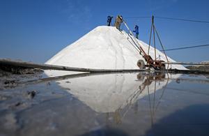(250428) -- TIANJIN, 28 abril, 2025 (Xinhua) -- Imagen del 27 de abril de 2025 de trabajadores empacando sal cosechada en una salina de Tianjin Changlu Haijing Group Co., Ltd., en Tianjin, en el norte de China. En los últimos días, los trabajadores de Tianjin Changlu Haijing Group Co., Ltd. han estado ocupados recolectando sal en sus 250.000 mu (unas 16.700 hectáreas) de salinas. La cosecha de sal de primavera suele comenzar entre mediados y finales de marzo y junio, dependiendo de las condiciones meteorológicas. (Xinhua/Zhao Zishuo) (rtg) (ah) (vf)