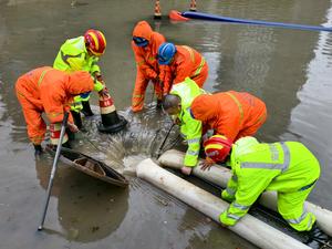 (250730) -- BEIJING, 30 julio, 2025 (Xinhua) -- Rescatistas trabajan para drenar el agua de una carretera inundada, en Ningbo, en la provincia de Zhejiang, en el este de China, el 30 de julio de 2025. Co-may, el octavo tifón de este año, tocó tierra por segunda vez en la municipalidad de Shanghai, en el este de China, el miércoles por la tarde después de tocar tierra en la provincia de Zhejiang la madrugada del miércoles, según el observatorio meteorológico central de Shanghai. (Xinhua/Hu Xuejun) (ah) (ra) (vf)