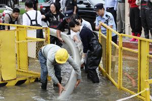 (250924) -- BEIJING, 24 septiembre, 2025 (Xinhua) -- Personas bombean agua de la inundación, en el distrito de Baoying, en la provincia de Jiangsu, en el este de China, el 24 de septiembre de 2025. Ragasa, el décimo octavo tifón del año, entró en el Mar Meridional de China el lunes por la noche y se encontraba a unos 170 km al sureste de la ciudad de Yangjiang a las 10:00 horas del miércoles. (Xinhua/Shen Dongbing) (ah) (ce)