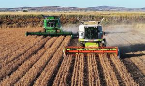 (241016) -- HARBIN, 16 octubre, 2024 (Xinhua) -- Imagen aérea tomada con un dron el 12 de octubre de 2024 de cosechadoras trabajando en campos de soja en una granja de Beidahuang Group, en la provincia de Heilongjiang, en el noreste de China. La cosecha de otoño en la provincia de Heilongjiang, una importante base de producción de cereales, está en pleno apogeo. (Xinhua/Wang Jinbin) (jg) (da) (ce)