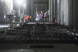(250223) -- BEIJING, 23 febrero, 2025 (Xinhua) -- Imagen del 22 de febrero de 2025 de trabajadores colocando vías en el sitio de construcción de la estación subcentral de Beijing a lo largo del ferrocarril interurbano Beijing-Tangshan, en el distrito de Tongzhou, subcentro de Beijing, capital de China. Con una velocidad diseñada de 350 kilómetros por hora, el ferrocarril interurbano Beijing-Tangshan de 148,7 kilómetros de largo unirá el centro de transporte integral del subcentro de Beijing en Beijing y la ciudad de Tangshan en la provincia de Hebei después de completar la sección de Beijing de la ruta. (Xinhua/Ju Huanzong) (rtg) (ah)