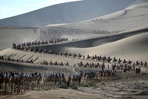 (250811) -- BEIJING, 11 agosto, 2025 (Xinhua) -- Imagen del 9 de agosto de 2025 de turistas visitando el punto escénico de la Montaña Mingsha y el Manantial de la Luna Creciente, en la ciudad de Dunhuang, en la provincia de Gansu, en el noroeste de China. Las áreas escénicas a lo largo de China han entrado a la temporada alta de turismo durante las vacaciones de verano. (Xinhua/Zhang Xiaoliang) (rtg) (ah) (ce)