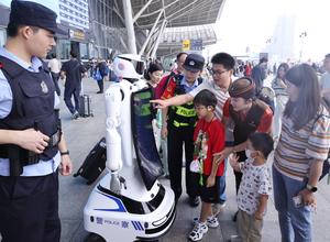 (251001) -- BEIJING, 1 octubre, 2025 (Xinhua) -- Niños interactúan con un robot en la Estación de Ferrocarriles de Wuhan, en Wuhan, en la provincia de Hubei, en el centro de China, el 1 de octubre de 2025. La red de transporte del país registró una temporada alta de viajes el primer día por las vacaciones del Día Nacional. (Xinhua/Zhao Jun) (ah) (ce)