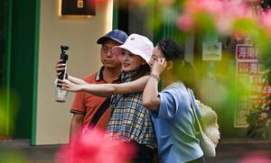 (251001) -- BEIJING, 1 octubre, 2025 (Xinhua) -- Turistas posan para una fotografía en la antigua calle Qilou, en Haikou, en la provincia de Hainan, en el sur de China, el 1 de octubre de 2025. Este año, con el Festival de Medio Otoño de China coincidiendo con el Día Nacional, unas vacaciones de ocho días que comienzan el miércoles están destinadas a dinamizar las economías locales a través de un aumento en el turismo cultural. (Xinhua/Yang Guanyu) (jg) (ra) (ce)