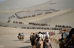 (250506) — BEIJING, 6 mayo, 2025 (Xinhua) — Imagen del 4 de mayo de 2025 de turistas visitando el punto escénico de la Montaña Mingsha y el Manantial de la Luna Creciente, en Dunhuang, en la provincia de Gansu, en el noroeste de China. Durante las vacaciones de cinco días por el Primero de Mayo, los viajeros chinos realizaron unos 314 millones de viajes internos, lo que representa un incremento del 6,4 por ciento respecto al año previo, según cifras publicadas por el Ministerio de Cultura y Turismo. (Xinhua/Zhang Xiaoliang) (jg) (ra) (vf)