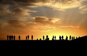 (251002) — BEIJING, 2 octubre, 2025 (Xinhua) — Turistas disfrutan el amanecer sobre el desierto en el área escénica de la Montaña Mingsha y el Manantial de la Luna Creciente, en la ciudad de Dunhuang, en la provincia de Gansu, en el noroeste de China, el 2 de octubre de 2025. Con el Festival de Medio Otoño de China coincidiendo este año con el Día Nacional, las personas pasan su tiempo libre de diferentes maneras durante las vacaciones de ocho días de duración. (Xinhua/Zhang Xiaoliang) (rtg) (ra) (ce)
