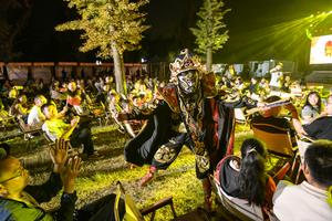 (251002) -- BEIJING, 2 octubre, 2025 (Xinhua) -- Imagen del 1 de octubre de 2025 de un artista realizando una presentación de Bianlian, o cambio de caras, una parte de la ópera de Sichuan, en un campo forestal en un parque industrial, en Chengdu, en la provincia de Sichuan, en el suroeste de China. Con el Festival de Medio Otoño de China coincidiendo este año con el Día Nacional, las personas pasan su tiempo libre de diferentes maneras durante las vacaciones de ocho días de duración. (Xinhua/Li Xiangyu) (rtg) (ra) (ce)