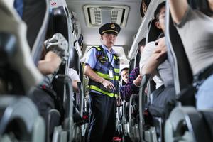 (251002) — BEIJING, 2 octubre, 2025 (Xinhua) — Un oficial de la ley de transporte inspecciona un autobús, en el distrito de Beibei de la municipalidad de Chongqing, en el suroeste de China, el 2 de octubre de 2025. Trabajadores de todos los ámbitos de la vida se han mantenido firmes en sus puestos y han cumplido con sus deberes con total dedicación durante los ocho días de vacaciones por el Día Nacional y el Festival del Medio Otoño. (Xinhua/Qin Tingfu) (jg) (ah) (ce)