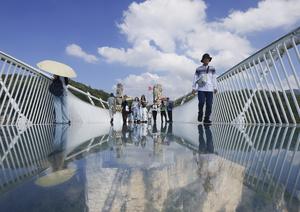 (251005) -- ZHANGJIAJIE, 5 octubre, 2025 (Xinhua) -- Turistas visitan un puente con suelo de cristal en el Gran Cañón de Zhangjiajie, en la provincia de Hunan, en el centro de China, el 5 de octubre de 2025. Los destinos turísticos de toda China están experimentando un aumento en el número de visitantes desde que el miércoles comenzó el feriado de ocho días por el Día Nacional y el Festival del Medio Otoño. (Xinhua/Wu Yongbing) (oa) (ah)