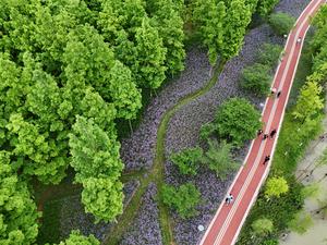 (250511) -- BEIJING, 11 mayo, 2025 (Xinhua) -- Vista aérea tomada con un dron del 11 de mayo de 2025 de ciudadanos disfrutando su tiempo libre en un parque, en Yueqing, en la provincia de Zhejiang, en el este de China. (Xinhua/Cai Kuanyuan) (rtg) (da)
