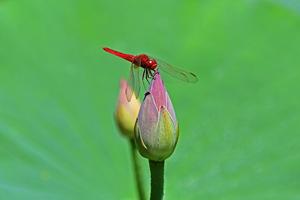 (250628) — BEIJING, 28 junio, 2025 (Xinhua) — Imagen del 25 de junio de 2025 de una libélula posándose sobre una flor de loto en un parque de humedales, en la ciudad de Yantai, en la provincia de Shandong, en el este de China. (Xinhua/Sun Wentan) (oa) (da)
