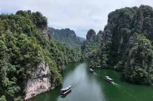 (250623) -- ZHANGJIAJIE, 23 junio, 2025 (Xinhua) -- Vista aérea tomada con un dron el 16 de junio de 2025 de turistas paseando en bote por el lago Baofeng, en el distrito de Wulingyuan, en Zhangjiajie, en la provincia de Hunan, en el centro de China. (Xinhua/Wu Yongbing) (oa) (rtg) (vf)