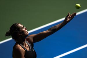 (251010) -- WUHAN, 10 octubre, 2025 (Xinhua) -- Aryna Sabalenka sirve la pelota durante el partido de cuartos de final de individuales femeninos entre Elena Rybakina, de Kazajistán, y Aryna Sabalenka, de Bielorrusia, en el torneo de tenis Wuhan Open 2025, en Wuhan, en la provincia de Hubei, en el centro de China, el 10 de octubre de 2025. (Xinhua/Xiao Yijiu) (rtg) (ra) (vf)