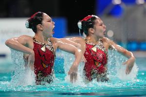 (250614) -- XI'AN, 14 junio, 2025 (Xinhua) -- Kobayashi Uta/Sato Tomoka, de Japón, compiten durante la final de dúo libre femenino en la Superfinal de la Copa del Mundo de Natación Artística 2025 de World Aquatics, en Xi'an, en la provincia de Shaanxi, en el noroeste de China, el 14 de junio de 2025. (Xinhua/Li Yibo) (rtg) (da)
