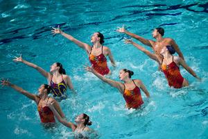 (250615) -- XI'AN, 15 junio, 2025 (Xinhua) -- El equipo de España realiza una presentación durante el espectáculo de gala de la Superfinal de la Copa del Mundo de Natación Artística 2025 de World Aquatics, en Xi'an, en la provincia de Shaanxi, en el noroeste de China, el 15 de junio de 2025. (Xinhua/Zou Jingyi) (rtg) (da)