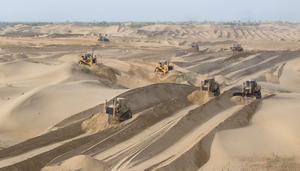 (250922) -- YULI, 22 septiembre, 2025 (Xinhua) -- Vista aérea tomada con un dron el 22 de mayo de 2025 de maquinaria de gran tamaño nivelando las dunas de arena, en el área de control y prevención desértica en la orilla sur del río Tarim, en el distrito de Yuli, en la región autónoma uygur de Xinjiang, en el noroeste de China. Aprovechando las características de la apocynum venetum de resistencia a la sequía, tolerancia a la sal y los álcalis, resistencia al frío y al calor, resistencia al viento y la arena, y fuerte adaptabilidad ecológica, las autoridades locales del distrito de Yuli, que se encuentra al borde del desierto de Taklimakan, han realizado esfuerzos para frenar la desertificación, promover el empleo y aumentar los ingresos de la población local mediante el desarrollo de la industria de apocynum venetum. (Xinhua/Wang Zhipeng) (rtg) (ah) (ce)