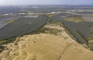(250922) -- YULI, 22 septiembre, 2025 (Xinhua) -- Vista aérea tomada con un dron el 20 de septiembre de 2025 del área de plantación de apocynum venetum (d-abajo), dunas de arena creadas naturalmente antes del tratamiento (i-abajo), y el río Tarim y los oasis que lo rodean (arriba), en el área de control y prevención desértica en la orilla sur del río Tarim, en el distrito de Yuli, en la región autónoma uygur de Xinjiang, en el noroeste de China. Aprovechando las características de la apocynum venetum de resistencia a la sequía, tolerancia a la sal y los álcalis, resistencia al frío y al calor, resistencia al viento y la arena, y fuerte adaptabilidad ecológica, las autoridades locales del distrito de Yuli, que se encuentra al borde del desierto de Taklimakan, han realizado esfuerzos para frenar la desertificación, promover el empleo y aumentar los ingresos de la población local mediante el desarrollo de la industria de apocynum venetum. (Xinhua/Chen Shuo) (rtg) (ah) (ce)
