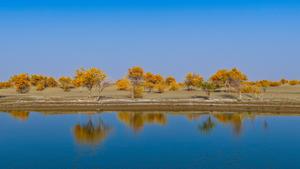 (251021) -- HOTAN, 21 octubre, 2025 (Xinhua) -- Imagen tomada con un dron el 20 de octubre de 2025 del paisaje de los bosques de populus euphratica rodeando un lago, en el distrito de Hotan de la prefectura de Hotan, en la región autónoma de la etnia uygur de Xinjiang, en el noroeste de China. Los bosques de populus euphratica de Hotan, en Xinjiang, han entrado recientemente en su mejor época para ser contemplados, ofreciendo un impresionante paisaje otoñal. (Xinhua/Xin Yuewei) (oa) (ah) (ce)