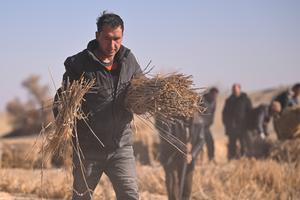 (260112) — MOYU, 12 enero, 2026 (Xinhua) — Imagen del 11 de enero de 2026 de agricultores colocando rejillas de césped en el desierto alrededor del poblado de Kawak, en el distrito de Moyu, en la prefectura de Hotan, en la región autónoma de la etnia uygur de Xinjiang, en el noroeste de China. La prevención y el control de la desertificación, una de las misiones prioritarias en Xinjiang desde hace muchos años, ofrece oportunidades de trabajo adicionales a los agricultores locales durante la temporada baja. A pesar de las temperaturas bajo cero, los agricultores locales se afanan en preparar juncos y colocar rejillas de arena. Además de consolidar la línea de seguridad ecológica de la zona, su contribución también supone unos ingresos adicionales para sus familias. (Xinhua/Ding Lei) (oa) (vf)