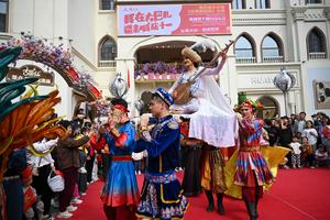 (251001) -- URUMQI, 1 octubre, 2025 (Xinhua) -- Actores realizan una presentación en el Gran Bazar Internacional de Xinjiang, en Urumqi, en la región autónoma uygur de Xinjiang, en el noroeste de China, el 1 de octubre de 2025. (Xinhua/Ding Lei) (jg) (ra) (ce)