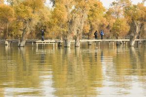 (251022) — XAYAR, 22 octubre, 2025 (Xinhua) — Turistas disfrutan del paisaje otoñal del bosque de álamos del desierto (populus euphratica), en el distrito de Xayar, en la región autónoma uygur de Xinjiang, en el noroeste de China, el 22 de octubre de 2025. (Xinhua/He Xiaotong) (ah) (ra) (ce)