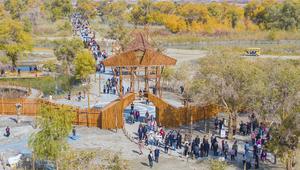 (251019) — YULI, 19 octubre, 2025 (Xinhua) — Imagen tomada con un dron el 18 de octubre de 2025 de turistas visitando un punto escénico, en el distrito de Yuli, en la prefectura autónoma mongola de Bayingolin, en la región autónoma uygur de Xinjiang, en el noroeste de China. Los bosques de populus euphratica y el Río Tarim ofrecen un paisaje otoñal impresionante en el desierto, atrayendo a muchos turistas a Xinjiang. (Xinhua/Wang Zhipeng) (oa) (ah)