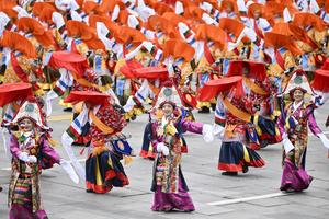 (250821) -- LHASA, 21 agosto, 2025 (Xinhua) -- Personas participan en un desfile masivo durante una gran reunión para conmemorar el 60º aniversario de la fundación de la región autónoma de Xizang, en Lhasa, en la región autónoma de Xizang, en el suroeste de China, el 21 de agosto de 2025. Unos 20.000 funcionarios locales y personas de todos los grupos étnicos y todos los ámbitos de la sociedad se unieron en la celebración. (Xinhua/Yin Bogu) (da) (ra) (ce)