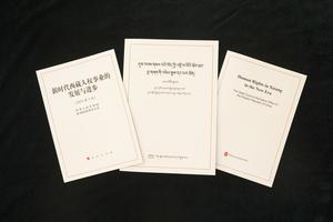(250328) -- LHASA, 28 marzo, 2025 (Xinhua) -- Imagen del 28 de marzo de 2025 de las versiones en chino, tibetano e inglés de un libro blanco titulado "Derechos humanos en Xizang en la nueva era" presentado en una conferencia de prensa, en Lhasa, en la región autónoma de Xizang, en el suroeste de China. El documento fue presentado por la Oficina de Información del Consejo de Estado en una conferencia de prensa realizada en Lhasa, capital de la región. (Xinhua/Jigme Dorje) (rtg) (ra) (ce)