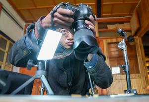 (250506) -- LHASA, 6 mayo, 2025 (Xinhua) -- Imagen del 5 de mayo de 2025 de Lhapa Dondrup tomando fotografías de un producto en una empresa, en Lhasa, en la región autónoma de Xizang, en el suroeste de China. Lhapa Dondrup, un hombre de 24 años nacido en Lhasa, padece osteogénesis imperfecta, comúnmente conocida como enfermedad de los huesos de cristal, desde la infancia. Ahora, como adulto, mide menos de un metro de altura y depende de muletas y una silla de ruedas eléctrica para desplazarse. A pesar de estos desafíos, Lhapa alberga el sueño de convertirse en fotógrafo. (Xinhua/Jigme Dorje) (oa) (ah) (vf)