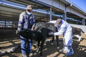 (251204) -- LHASA, 4 diciembre, 2025 (Xinhua) -- Imagen del 3 de diciembre de 2025 de dos trabajadores examinando una ternera Zhangmu clonada, en la estación experimental Qushui del centro de prevención y control de enfermedades animales a nivel regional, en Lhasa, en la región autónoma de Xizang, en el suroeste de China. La cría hembra clonada de Zhangmu nació en mayo. Ha sobrevivido casi siete meses con buena salud. Gracias a la tecnología de clonación y a múltiples medidas de conservación, la población de ganado Zhangmu ha aumentado a 37. (Xinhua/Tenzin Nyida) (da) (ra) (ce)
