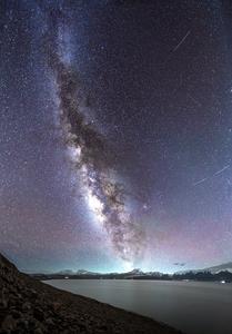 (250817) -- XIGAZE, 17 agosto, 2025 (Xinhua) -- Imagen del 14 de agosto de 2025 de la Vía Láctea y una lluvia de meteoritos sobre Baiku Co, en la ciudad de Xigaze, en la región autónoma de Xizang, en el suroeste de China. Baiku Co, con una superficie de agua de aproximadamente 300 kilómetros cuadrados, se encuentra a una altitud de 4.590 metros. Gracias a la excelente calidad del aire en la meseta, la Vía Láctea se puede ver claramente en el cielo estrellado a finales del verano y principios del otoño, creando un magnífico paisaje junto con el lago y las montañas nevadas. (Xinhua/Ma Lichao) (rtg) (ah)