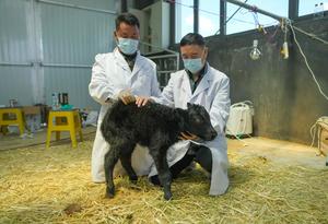 (250711) -- LHASA, 11 julio, 2025 (Xinhua) -- Empleados inspeccionan un yak clonado en una base de cría de yaks, en el distrito de Damxung, en la región autónoma de Xizang, en el suroeste de China, el 11 de julio de 2025. Un yak clonado nació recientemente por cesárea en una base de cría de yaks en el distrito de Damxung, en la región autónoma de Xizang, en el suroeste de China, dijeron los investigadores. Los científicos utilizaron tecnologías de selección del genoma completo y clonación de células somáticas para producir el yak clonado. (Xinhua/Jigme Dorje) (rtg) (ra) (ce)
