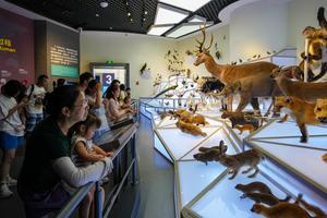 (250716) -- CHENGJIANG, 16 julio, 2025 (Xinhua) -- Imagen del 15 de julio de 2025 de visitantes observando especímenes de animales en el museo del patrimonio natural mundial del sitio de Fósiles de Chengjiang, en el distrito de Chengjiang, en la provincia de Yunnan, en el suroeste de China. Este museo, el primero de su tipo construido en un sitio de fósiles en el país, ha sido testigo de un aumento en las visitas y viajes de estudio desde el comienzo de las vacaciones de verano. (Xinhua/Chen Xinbo) (ah) (ra) (vf)
