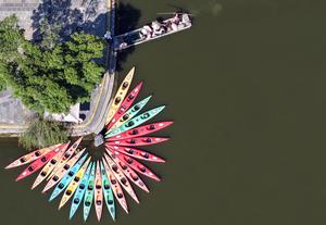 (250730) — DALI, 30 julio, 2025 (Xinhua) — Vista aérea tomada con un dron el 29 de julio de 2025 de turistas tomando un bote en el parque de humedales de Xihu, en el distrito de Eryuan, en la prefectura autónoma bai de Dali, en la provincia de Yunnan, en el suroeste de China. (Xinhua/Liang Zhiqiang) (ah) (ra) (vf)