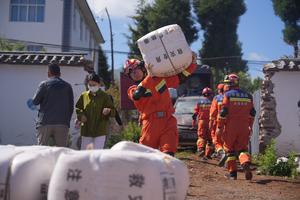 (250605) -- ERYUAN, 5 junio, 2025 (Xinhua) -- Un rescatista mueve suministros de socorro, en la aldea de Baicao del distrito de Eryuan, en la prefectura autónoma bai de Dali, en la provincia de Yunnan, en el suroeste de China, el 5 de junio de 2025. Un sismo de magnitud 5,0 ocurrió el jueves a las 04:31 hora local en el distrito de Eryuan, indicó el Centro de Redes Sismológicas de China. (Xinhua/Luo Xincai) (rtg) (ra) (vf)