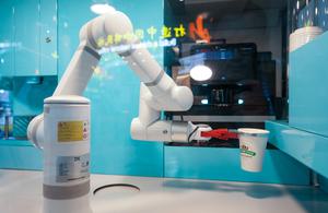 (250620) -- KUNMING, 20 junio, 2025 (Xinhua) -- Imagen del 20 de junio de 2025 de un robot para preparar café en el Pabellón de la Industria del Café en la IX Exposición China-Sur de Asia, en Kunming, en la provincia de Yunnan, en el suroeste de China. Prominentes compañías de café de países como Panamá, El Salvador y Pakistán también han sido invitadas a la exposición. (Xinhua/Chen Xinbo) (rtg) (ra) (vf)