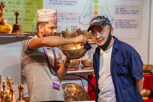 (250621) -- KUNMING, 21 junio, 2025 (Xinhua) -- Un visitante (d) experimenta con un cuenco cantor nepalí, una especie de herramienta para terapia de sonido, en el Pabellón del Sur de Asia durante la IX Exposición China-Sur de Asia, en Kunming, en la provincia de Yunnan, en el suroeste de China, el 21 de junio de 2025. El evento de seis días de duración, inaugurado el jueves en Kunming, cuenta con 16 salas de exposición. Cerca de 500 empresas de ocho países del sur de Asia participan en el evento. (Xinhua/Peng Yikai) (jg) (rtg) (oa) (da)