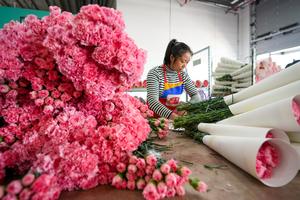 (250123) -- KUNMING, 23 enero, 2025 (Xinhua) -- Imagen del 22 de enero de 2025 de una trabajadora envolviendo flores en una empresa de flores, en Kunming, en la provincia de Yunnan, en el suroeste de China. A medida que se acerca el Festival de Primavera chino, los mercados de flores en Kunming entran en su temporada alta de ventas de flores para festivales. (Xinhua/Chen Xinbo) (jg) (ah) (ce)