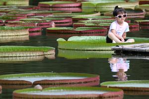 (250712) — KUNMING, 12 julio, 2025 (Xinhua) — Una niña se sienta en una hoja de un lirio de agua gigante en el Jardín Botánico Tropical de Xishuangbanna de la Academia de Ciencias de China, en el distrito de Mengla, en la prefectura autónoma dai de Xishuangbanna, en la provincia de Yunnan, en el suroeste de China, el 12 de julio de 2025. Los destinos turísticos en Yunnan entraron a su temporada alta de turismo con el comienzo de las vacaciones de verano. (Xinhua/Li Yunsheng) (rtg) (da)