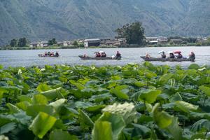 (250712) — KUNMING, 12 julio, 2025 (Xinhua) — Turistas navegan en botes, en la prefectura autónoma bai de Dali, en la provincia de Yunnan, en el suroeste de China, el 12 de julio de 2025. Los destinos turísticos en Yunnan entraron a su temporada alta de turismo con el comienzo de las vacaciones de verano. (Xinhua/Luo Xincai) (rtg) (jg) (da)