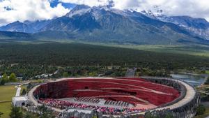 (251026) -- LIJIANG, 26 octubre, 2025 (Xinhua) -- Vista aérea tomada con un dron el 26 de octubre de 2025 de turistas observando una presentación en el punto escénico de la Montaña Nevada Yulong, en la ciudad de Lijiang, en la provincia de Yunnan, en el suroeste de China. (Xinhua/Hu Chao) (oa) (ah)