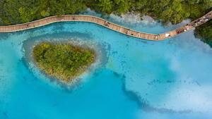 (250908) -- LIJIANG, 8 septiembre, 2025 (Xinhua) -- Vista aérea tomada con un dron el 8 de septiembre de 2025 de turistas visitando el valle de Lanyue (Luna Azul), en la ciudad de Lijiang, en la provincia de Yunnan, en el suroeste de China. (Xinhua/Hu Chao) (oa) (ah) (ce)