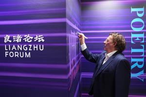 (251018) -- HANGZHOU, 18 octubre, 2025 (Xinhua) -- El poeta español, Juan Carlos Mestre, firma su autógrafo a su llegada al Salón Mundial de Poesía, Danza, Música y Artes Visuales, en Hangzhou, en la provincia de Zhejiang, en el este de China, el 18 de octubre de 2025. El Salón Mundial de Poesía, Danza, Música y Artes Visuales se llevó a cabo aquí el sábado como evento paralelo al tercer Foro de Liangzhu. El salón ofrece presentaciones y diálogos sobre civilizaciones, con la participación de más de 20 artistas y estudiosos de la cultura internacionales. (Xinhua/Huang Zongzhi) (jg) (da)